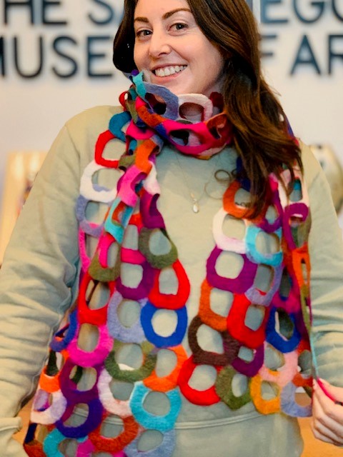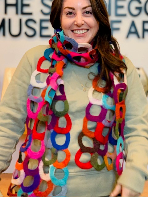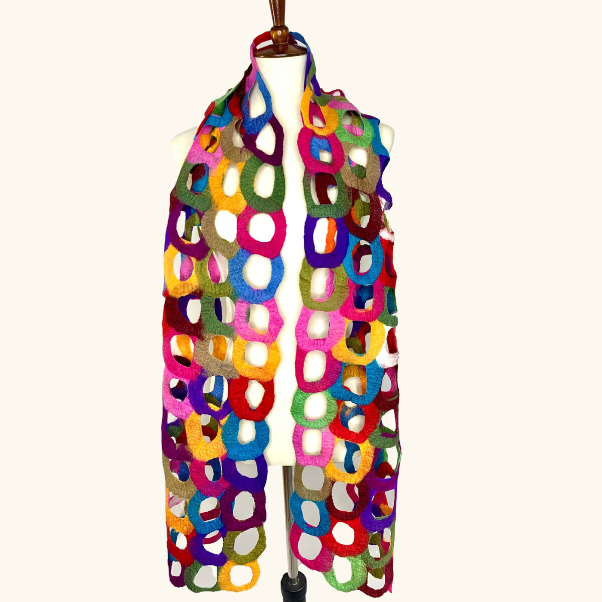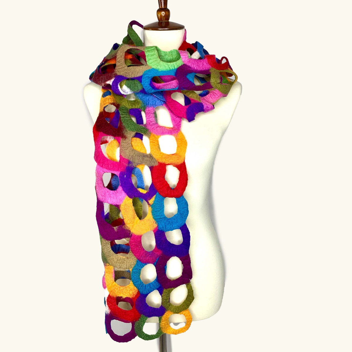 Beautiful colors interlocked together with a ring design. Bring some color to your world! Each scarf is made in Nepal using fair trade and socially responsible practices. The Nepalese artisans create these quality handmade fashion accessories while promoting environmentally sustainable applications. They use nuno felting process creating garments that are lightweight and drape beautifully on the body.