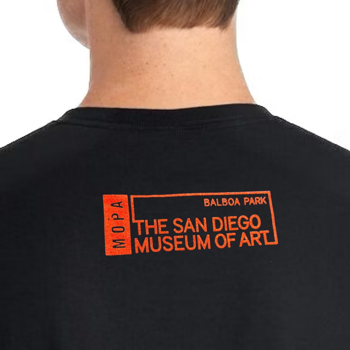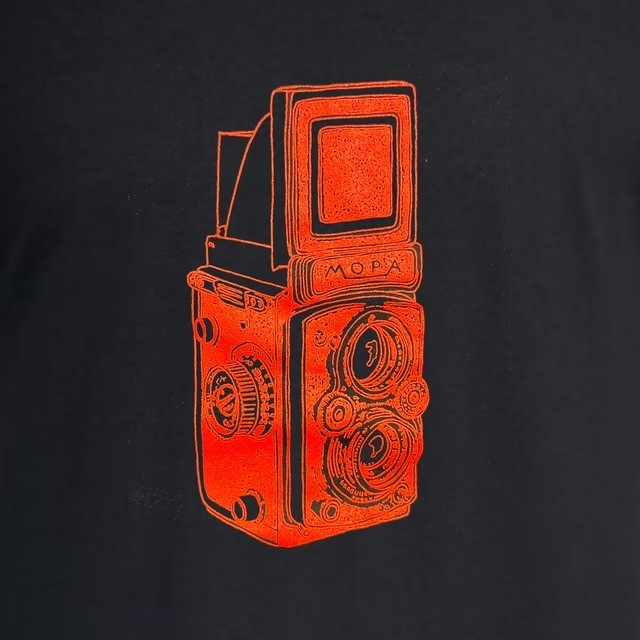 Celebrate the art of photography in style. This black cotton MOPA@SDMA shirt showcases a striking red twin-lens reflex (TLR) camera graphic on the front, celebrating the timeless art of photography. The MOPA@SDMA logo appears across the upper back for a clean, signature detail.
